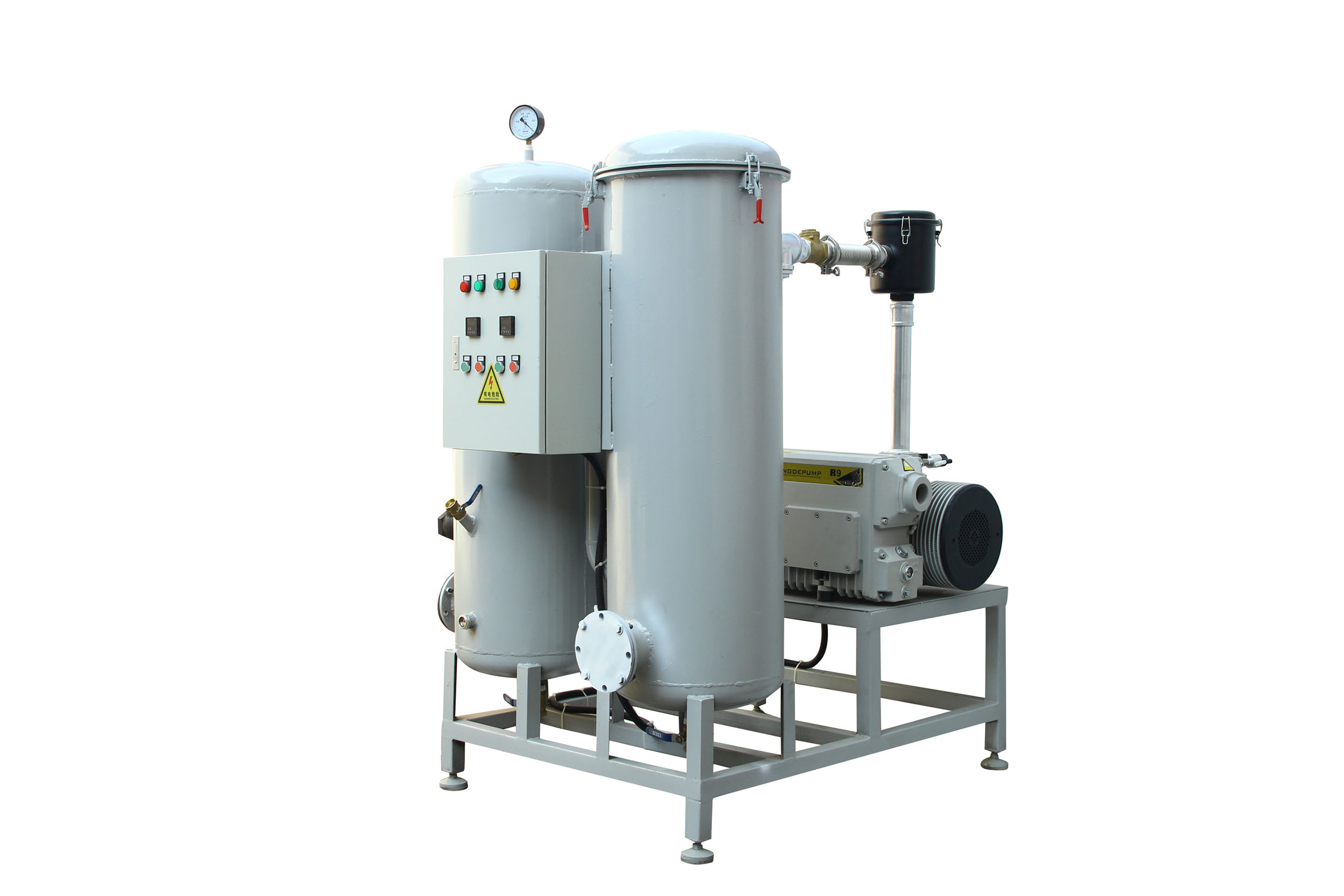 移動式真空負壓站一般包含真空緩沖罐、真空泵、控制制箱、冷卻卻器、真空附件、真空度報警系統;該系列負壓站包含兩種類型,即開放式真空負壓站和封閉式真空負壓站,客戶使用環境良好,操作簡單,成本要求嚴格,則可做開放式真空負壓站;客戶使用環境惡劣,有大量粉塵,可凝性氣體,腐蝕性氣體等環境,則做成封閉式。